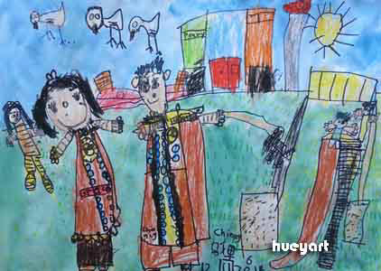 我和朋友(彩色笔、水彩画) 马千里 6岁